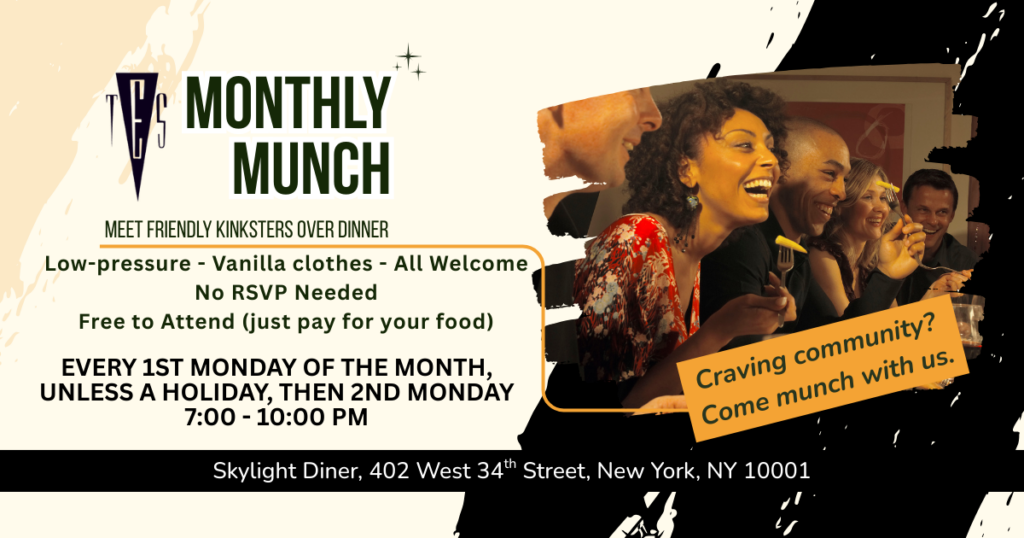 IN-PERSON: TES Monthly Munch We’d love to have you at the TES Monthly Munch! Whether you’re new to the scene, an old friend, or just curious, our monthly munch is a great opportunity to meet fellow kinksters in a low-key, low-pressure setting. There’s no need to RSVP, and everyone is welcome—you don’t even have to be a TES member to join us! We gather on the first Monday of every month (if it’s a holiday, we’ll meet on the following Monday) at an alternative lifestyle-friendly diner in NYC. Our hosts will be there to give you a warm welcome and answer any questions. Attending is free; you just pay for your food, and please remember to tip your server well! We also ask that you wear “vanilla” (non-BDSM) clothes. This is a vanilla event. Respect others’ privacy and consent by not displaying any kink activities in this public space. A Note on Safety This event is held at a public diner, and while we highly encourage all attendees to be vaccinated against COVID-19, we cannot control what the restaurant requires of other patrons. Please assess your own risk and act accordingly. We will have a discreet contact tracing option available, which we encourage you to use. For more information, including a code of conduct for newcomers, please visit our FAQ page. We can’t wait to see you there!… Continue Reading