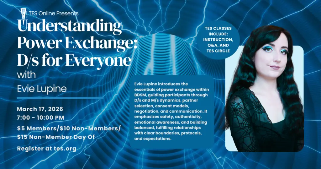 ONLINE: Becoming a Dungeon Monitor with Youngscientist Do you want to start volunteering as a DM in the scene? Are you a staff member for an organization and need to brush up on safety knowledge in play spaces? Maybe you just really like wearing neon vests at parties? This class will primarily teach community members how to bridge their own scene knowledge, life skills, and critical thinking to facilitate safe play spaces and deal with various situations that may arise as a representative of a BDSM organization. Some subjects that will be covered include, but aren’t limited to, maintaining party rules and etiquette, advanced play and scene limitations, equipment and dungeon safety, methods of communication, risk management, professionalism, consent and negotiation breakdowns, scene intervention, conflict resolution and de-escalation, and critical first aid. All experience levels are welcome to attend, but please note that this class will cover many subjects that are above the novice level. Bio: Youngscientist has been active in many facets of the scene for over 15 years. He’s volunteered and worked staff for at least a dozen organizations throughout that time, including being one of the few Pro-DMs in the NYC area. Knowledge has been one of his main driving forces, which led him to start teaching early on. He’s probably most well known for teaching Wrestling/Grappling classes and hosting Jello and Lube Wrestling events. TO REGISTER: MEMBERS – $5 Create a Member Portal account using the same email address used when you purchased your membership. (Email membership@tes.org if you have forgotten the one you used when registering for TES.) Be sure to respond to the confirmation email & choose a password. After that, log back into the Member Portal. To complete your purchase, click on this link and follow the instructions. Your membership discount will be automatically applied. NON-MEMBERS – $10 /$15 day of event Click here to register for this class. If cost is a barrier to attendance, please email customer-care@tes.org. REGISTRATION CLOSES 30 MINUTES BEFORE THE START OF CLASS! ALL QUESTIONS GO TO CUSTOMER-CARE@TES.ORG! YOU WILL RECEIVE THE LOGIN LINK WITH THE CONFIRMATION EMAIL. **Note – if you are seeing an “event ended” screen – try one or more of the following: Refresh Clear cache Try a different browser** The DatingKinky platform is supported by multiple browsers, but if you are having any technical difficulties, please try a different browser, as certain settings may interfere. Note that this link will only be active during scheduled meeting times. You are welcome to participate as actively as you are comfortable. By default, users’ cameras and microphones will be switched off, and you may simply watch passively or participate solely by text in the chat box if you are uncomfortable being seen or heard. Please note that while we have selected this platform to be as private as possible while maintaining sufficient ease of use for participants, no online platform is ever fully secure. While all regular TES rules regarding privacy remain in effect, and anyone caught violating these rules will be subject to consequences (please see our Online Meeting Terms of Service), we advise participants to treat online events as though the event is being recorded by a third party. For more information on protecting your online privacy, please see our online privacy guide…. Continue Reading