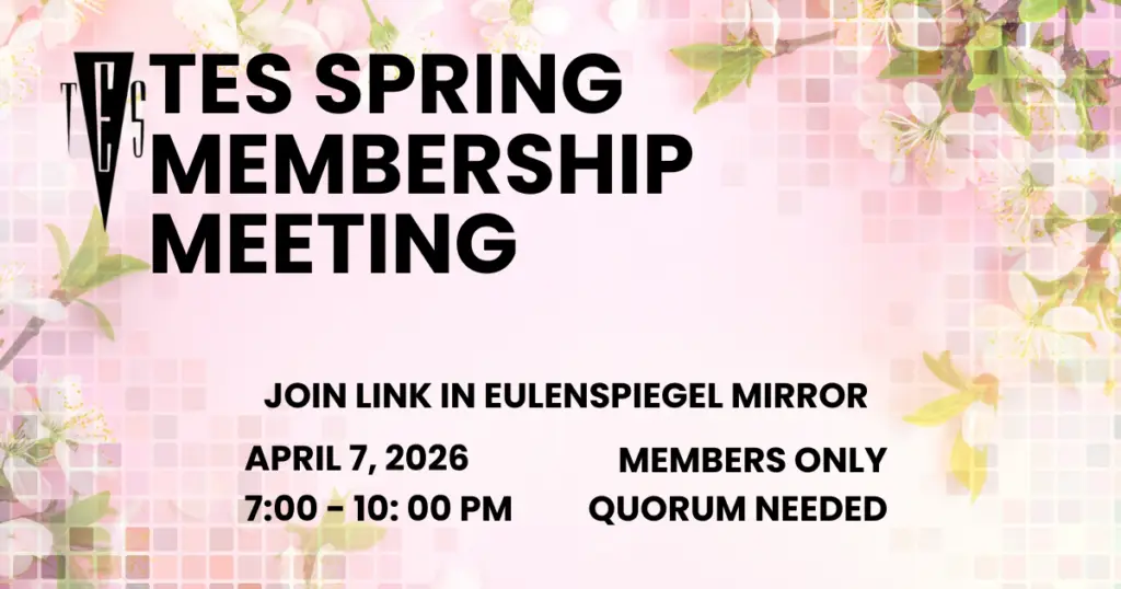 ONLINE – TES Board Meeting Are you a current TES member? You’re invited to our monthly board meeting! This is your chance to connect with fellow members, hear what the board is working on, and help shape the future of our organization. This meeting is online only and is open to current TES members only. How to Join All members receive details on how to join the meeting in our monthly newsletter, The Eulenspiegel Mirror, sent on the first of the month. If you are a current member and didn’t receive the information, please email us at secretary@tes.org. We Have Board Vacancies! Looking to get more involved? We have several board vacancies and would love for you to join us. If you’re interested, you can review the requirements and nominate yourself. Not a Member Yet? If you’re interested in becoming a member or need to renew your membership, you can do so here. We’d love to have you!… Continue Reading