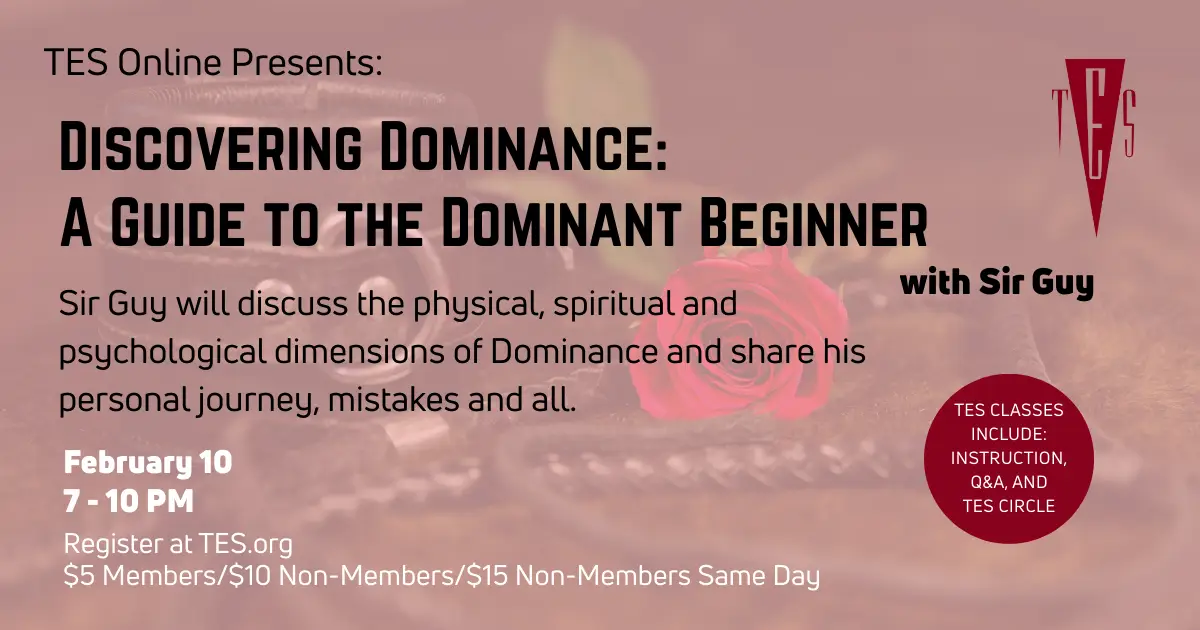 TES Online – Discovering Dominance: A Guide to the Dominant Beginner February 10 @ 7:00 PM - 10:00 PM Online Many and varied are the guides and resources for those who are new to the submissive lifestyle, but those who are new to the Dominant side appear to have limited avenues to explore. Are the expectations for the Dominant in relationships higher? Should they be? What types of skills are essential? Are they physical skills, like flogging, using the single tail whip, or rope bondage? Is there something deeper, more complicated than that? Sir Guy will discuss the physical, spiritual, and psychological dimensions of Dominance, as well as share his personal journey, mistakes, and all. Topics include the attributes of leadership, command presence, and other poignant aspects using military, religious, and business sources and models to explore and develop Dominance for the beginner. Bio: Sir Guy (He/Him) is a covered Master, Dominant Leatherman, educator, author, and activist. He heads the House of the Black Panther and leads the group, The Dark Lair: a BDSM Education and Support group for People of Color. Sir Guy has been in the lifestyle for 20+ years, has held several organizational leadership roles, and has also held a title. He has judged relationship-based Leather titles, given several keynote addresses, and won awards, including the Master Jack McGeorge Excellence in Education Award, the MAsT International People's Choice Presenter of the Year Award, and the Sir Leon Strange Memorial Award, among others. In addition, He has written several chapters in prominent lifestyle-related books and has spoken at Columbia and Hofstra Universities. Sir Guy is a uniform enthusiast, former police officer, EMS supervisor, and Ground Zero first responder. To register: MEMBERS – $5 Create a Member Portal account using the same email address used when you purchased your membership. (Email membership@tes.org if you have forgotten the one you used when registering for TES.) Be sure to respond to the confirmation email & choose a password. After that, log back into the Member Portal. To complete your purchase, click on this link and follow the instructions. Your membership discount will be automatically applied. NON-MEMBERS – $10 /$15 day of event Click here to register for this class. If cost is a barrier to attendance, please email customer-care@tes.org REGISTRATION CLOSES 30 MINUTES BEFORE THE START OF CLASS! ALL QUESTIONS GO TO CUSTOMER-CARE@TES.ORG! YOU WILL RECEIVE THE LOGIN LINK WITH THE CONFIRMATION EMAIL. **Note – if you are seeing an “event ended” screen – try one or more of the following: Refresh Clear cache Try a different browser** The DatingKinky platform is supported by multiple browsers, but if you are having any technical difficulties, please try a different browser, as certain settings may interfere. Note that this link will only be active during scheduled meeting times. You are welcome to participate as actively as you are comfortable. By default, users’ cameras and microphones will be switched off, and you may simply watch passively or participate solely by text in the chat box if you are uncomfortable being seen or heard. Please note that while we have selected this platform to be as private as possible while maintaining sufficient ease of use for participants, no online platform is ever fully secure. While all regular TES rules regarding privacy remain in effect, and anyone caught violating these rules will be subject to consequences (please see our Online Meeting Terms of Service), we advise participants to treat online events as though the event is being recorded by a third party. For more information on protecting your online privacy, please see our online privacy guide.