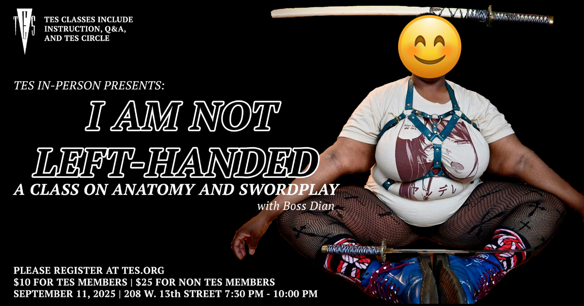 7:00 PM - 10:00 PM IN-PERSON – I Am Not Left-Handed: A Class on Anatomy and Swordplay September 11 @ 7:00 PM - 10:00 PM IN-PERSON – I Am Not Left-Handed: A Class on Anatomy and Swordplay Hone your impact scenes with Boss Dian's 'Anatomy and Swordplay' class. This informative session covers the proper use of swordplay with anatomy fundamentals. This beginner-friendly class, open to all tops and bottoms, will explore how to incorporate swordplay into your scenes. Boss Dian will lead discussions and demonstrations on how to use their favorite impact tool. They will provide information on negotiation, safe striking areas of the body, and ensuring both safety and dramatic effect. *This is an impact class. There will be no cutting scenes during the demonstration. Bio: The Boss Dian, lifestyle switch, professional Dominatrix, and occasional kink muppet, has been cackling maniacally at parties and dungeons since 2009. An impact top, Dian loves finding unique tools and skills to optimize a scene. Ask about the time they used drumsticks and a rubber chicken one evening. Location and Cost Location: The Center (The Lesbian, Gay, Bisexual & Transgender Community Center) 208 West 13th Street, New York, NY 10011 Cost: Members: $10 Non-Members: $25 Registration in advance is strongly encouraged due to limited internet access at the venue. Note: Each attendee will need to have a separate account to register. Online Registration: If You Already Have an Account Register: Click here to go to the class registration page. Log in: Use your existing account information to log in and register for the class. Your membership discount will be applied automatically. Complete Purchase: Follow the instructions to complete your payment. Your membership discount will be automatically applied. If You Need to Create an Account For Members: Create Your Account: Go to the Member Portal and create your account here. Be sure to use the same email address you used when you purchased your TES membership. If you've forgotten it, email membership@tes.org for assistance. Confirm Your Email: Check your inbox for a confirmation email and follow the link to set your password. Log In and Register: Click this link to log back into the Member Portal and register for the class. Complete Purchase: Follow the instructions to complete your payment. Your membership discount will be automatically applied. For Non-Members: Create Your Account: Go to the registration page and create your member portal account here. Confirm Your Email: Check your inbox for a confirmation email and follow the link to enter your password. Log In and Register: Click this link to log back into the Member Portal and register for the class. Complete Purchase: Follow the instructions to complete your payment. On-Site Registration On-site registration is available, but please be aware that internet access may be limited. You will be able to register by scanning a QR code with your smartphone. The registration process is the same as the advanced registration steps listed above. Cash payments are not accepted at the door.
