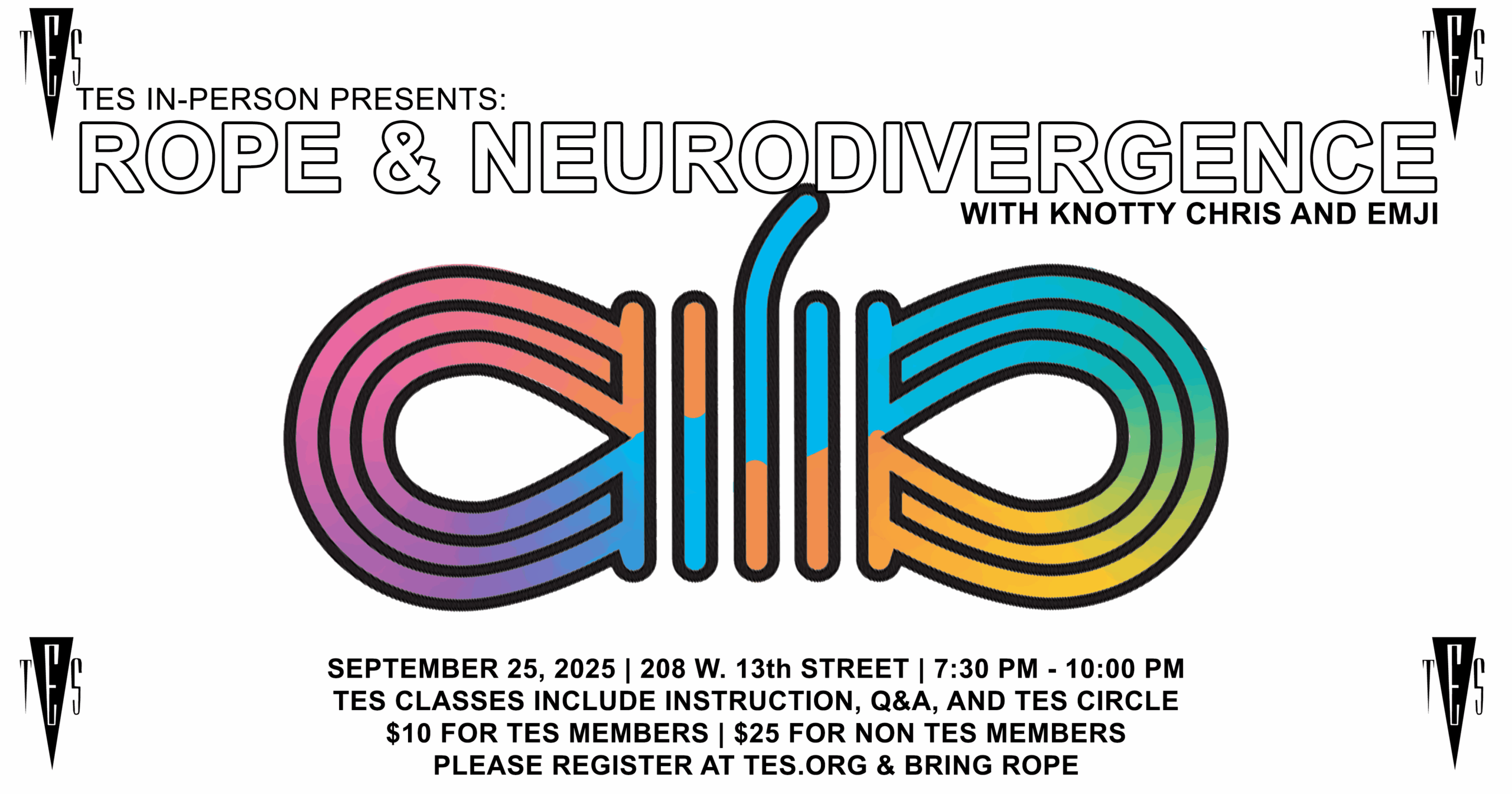7:00 PM - 10:00 PM IN-PERSON: Rope and Neurodivergence September 25 @ 7:00 PM - 10:00 PM IN-PERSON: Rope and Neurodivergence This class will explore the fascinating intersection of rope and neurodivergence. We'll delve into how elements like deep pressure, clear communication, sensory stimulation, and grounding, which are central to both BDSM and neurodivergence, beautifully overlap within the community. Drawing from both lived autistic/neurodivergent experience and extensive rope practice, the class will discuss and demonstrate: How topping and bottoming rope resonate in this context Important accommodations and considerations Neurodivergent-inclusive negotiation, tying, and active bottoming There will also be time for hands-on exploration for those who are interested, so bring your rope. Bios: Knotty Chris (he/him): Chris is a bottom/sub-leaning switch deeply involved in the NYC rope and kink scene since January 2024. He views rope & bondage as a connective somatic language and BDSM as a form of self-expression, shared energy, and joyful co-creation. As a passionate community builder and neurodivergent kinkster, Chris organizes two local munches (the movie-focused CineMunch and the neurodivergent-centered The Yap), and facilitates the Bushwick Rope Share and the movie night/rope jam CineNawa. Emji (they/them): With a decade of experience in feeling, interacting, and connecting with rope, Emji, "the 'little' rigger," deeply values the connection between bottom and rigger. Their first and greatest love is rope, and they are a strong advocate for active bottoming and thorough negotiation. When not engaged in rope experiences and education, Emji enjoys "little" adventures with their "little" friends around the city. Location and Cost Location: The Center (The Lesbian, Gay, Bisexual & Transgender Community Center) 208 West 13th Street, New York, NY 10011 Cost: Members: $10 Non-Members: $25 Registration in advance is strongly encouraged due to limited internet access at the venue. Note: Each attendee will need to have a separate account to register. Online Registration: If You Already Have an Account Register: Click here to go to the registration page. Log in: Use your existing account information to log in and register for the class. Your membership discount will be applied automatically. Complete Purchase: Follow the instructions to complete your payment. If You Need to Create an Account For Members: Create Your Account: Go to the Member Portal and create your account here. Be sure to use the same email address you used when you purchased your TES membership. If you've forgotten it, email membership@tes.org for assistance. Confirm Your Email: Check your inbox for a confirmation email and follow the link to set your password. Log In and Register: Click this link to log in and register for the class. Your membership discount will be applied automatically. Complete Purchase: Follow the instructions to complete your payment. Your membership discount will be automatically applied. For Non-Members: Create Your Account: Go to the registration page and create your account here. Confirm Your Email: Check your inbox for a confirmation email and follow the link to set your password. Log In and Register: Click this link to log in and register for the class. Complete Purchase: Follow the instructions to complete your payment. On-Site Registration: On-site registration is available, but please be aware that internet access may be limited. You will be able to register by scanning a QR code with your smartphone. The registration process is the same as the advanced registration steps listed above. Cash payments are not accepted at the door.