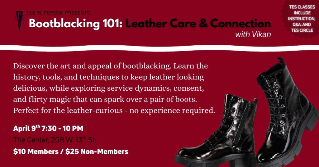 TES IN PERSON – Bootblacking 101: Leather Care & Connection A beginner-friendly dive into the how and why of bootblacking. We’ll cover a bit of history, break down common materials and tools, and demonstrate techniques that keep leather looking (and feeling) delicious. We’ll also discuss consent, service dynamics, and the …