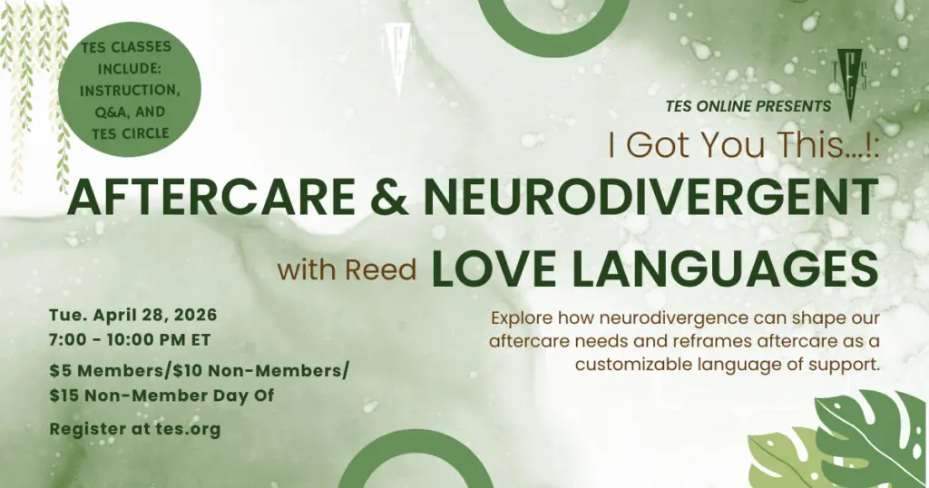 TES Online – I Got You This…!”: Aftercare & Neurodivergent Love Languages Not all aftercare looks like cuddles and snackies—and for neurodivergent folks, traditional ideas of care can feel confusing, overwhelming, or just not quite right. This class explores how neurodivergence can shape our aftercare needs, expressions of affection, and recovery from …