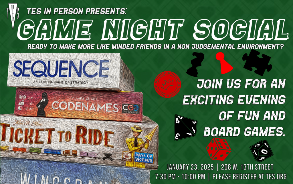 IN-PERSON – Game Night Social Ready to make more like-minded friends in a non-judgmental environment? Join us for an exciting evening of fun and board games. Get together with your @TES-NYC friends for a relaxing social. While we will have some popular board games available, feel free to bring some of your favorites. All are welcome. Please register before attending for convenience and more fun! To register in advance (strongly preferred): If you already have a TES account, CLICK HERE TO REGISTER Create a Member Portal account Members: Use the same email address used when you purchased your membership. (Email membership@tes.org if you have forgotten the one you used when registering for TES.) Be sure to respond to the confirmation email & choose a password. After that, log back into the Member Portal. Non-members: You will still need to make an account to register. Be sure to respond to the confirmation email & choose a password. After that, log back into the Member Portal. To complete your purchase, click THIS LINK and follow the instructions. Your membership discount will be automatically applied. To register on-site: There will be a QR code available to allow you to register on-site following the same process above, but TES will not be able to accept cash at the door. If cost is a barrier to attendance, please email customer-care@tes.org… Continue Reading